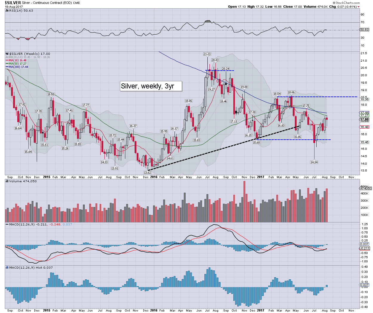 The August close of $3.10, is the highest monthly close since August 2014.. a full three years ago. Short term, copper is over-stretched. It would be no surprise to see the $3.00 threshold tested a few times across Sept/October.